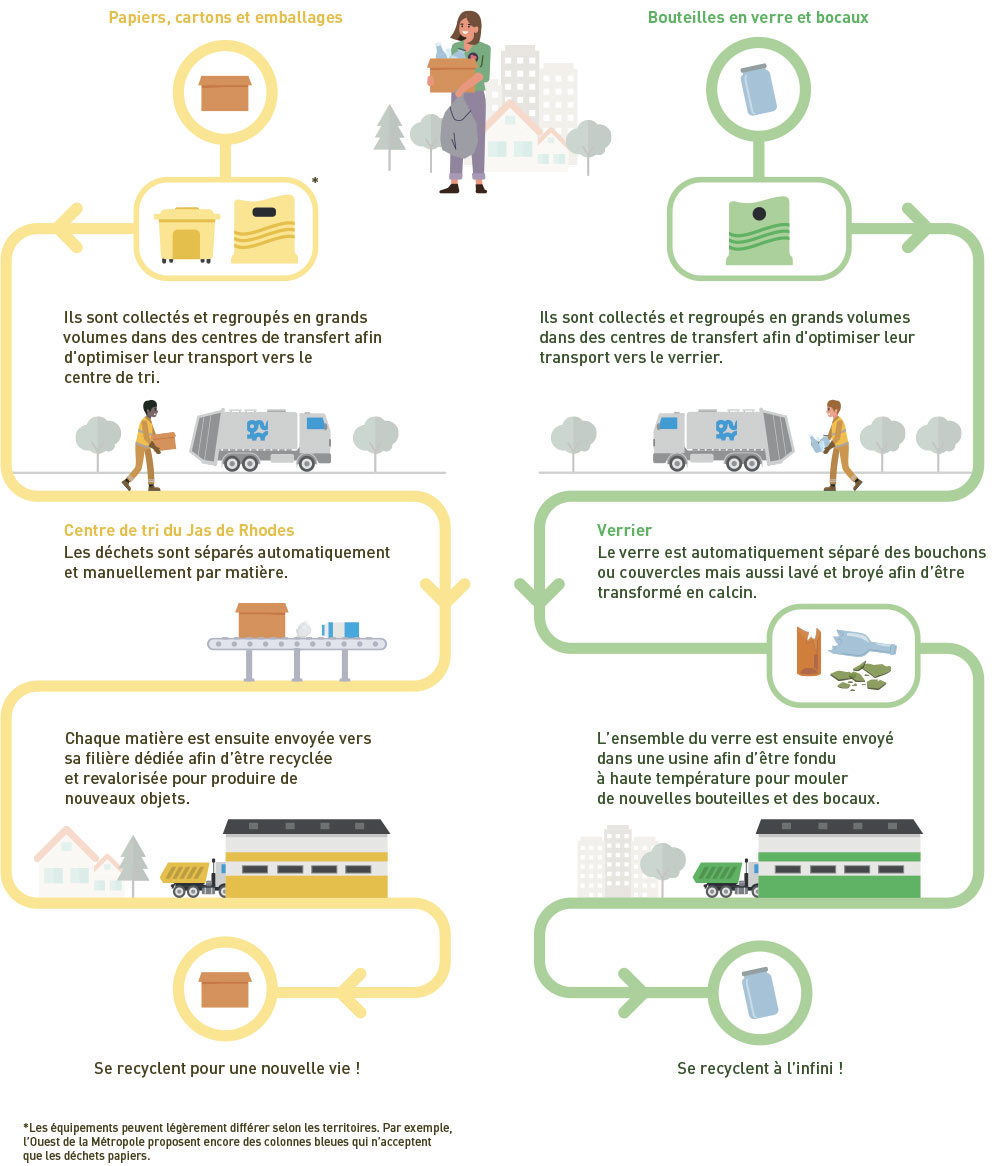 La Métropole recycle à 80 % les emballages, les cartons, le papier et à 100 % le verre, qui sont collectés dans les dispositifs de tri du territoire.